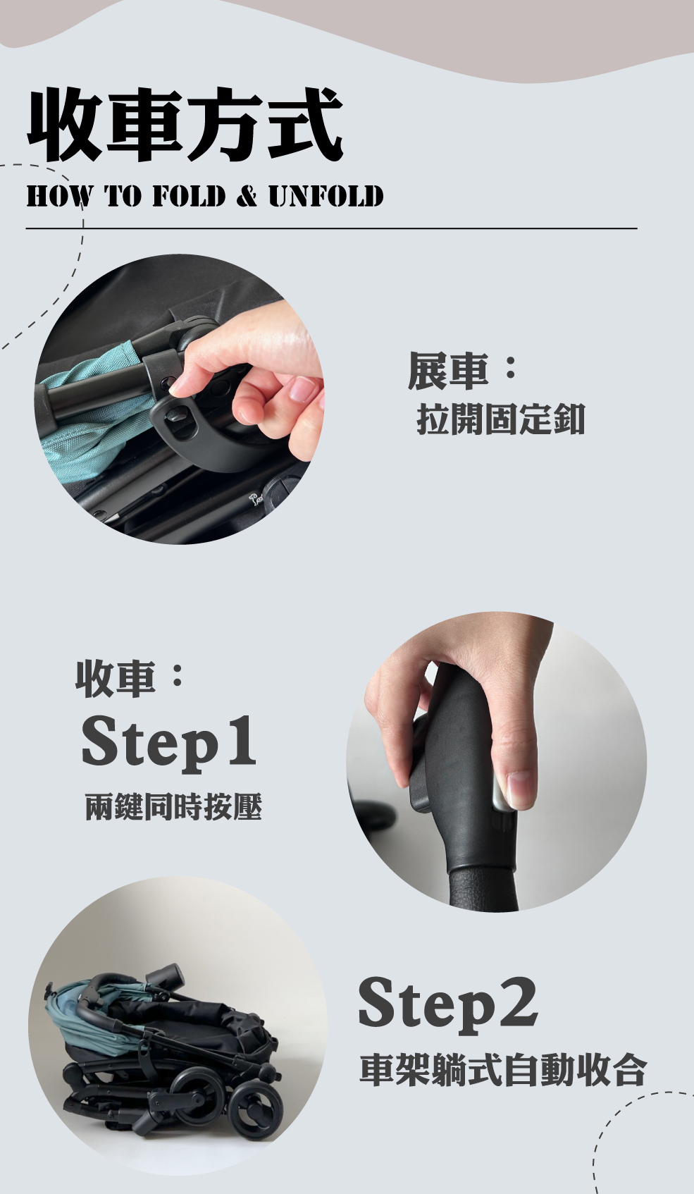 ✤ 躺式自動收折,收車時無需將下方置物籃物品先取出